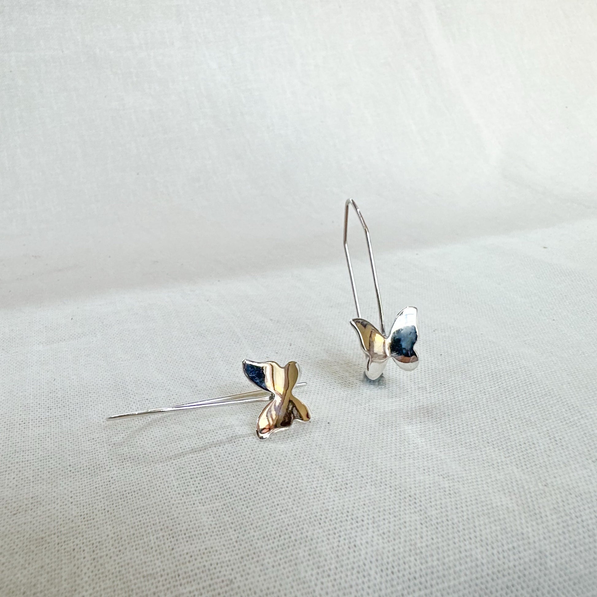 Arete de plata 925 con diseño de mariposa, terminado al alto brillo para capturar la luz en cada ángulo. Longitud total de 3.7 cm (1.46”) y ancho de la mariposa de 1.4 cm (0.55”). Hecho a mano en nuestro taller en Taxco, Guerrero. Disponible para venta al mayoreo en México e internacionalmente.