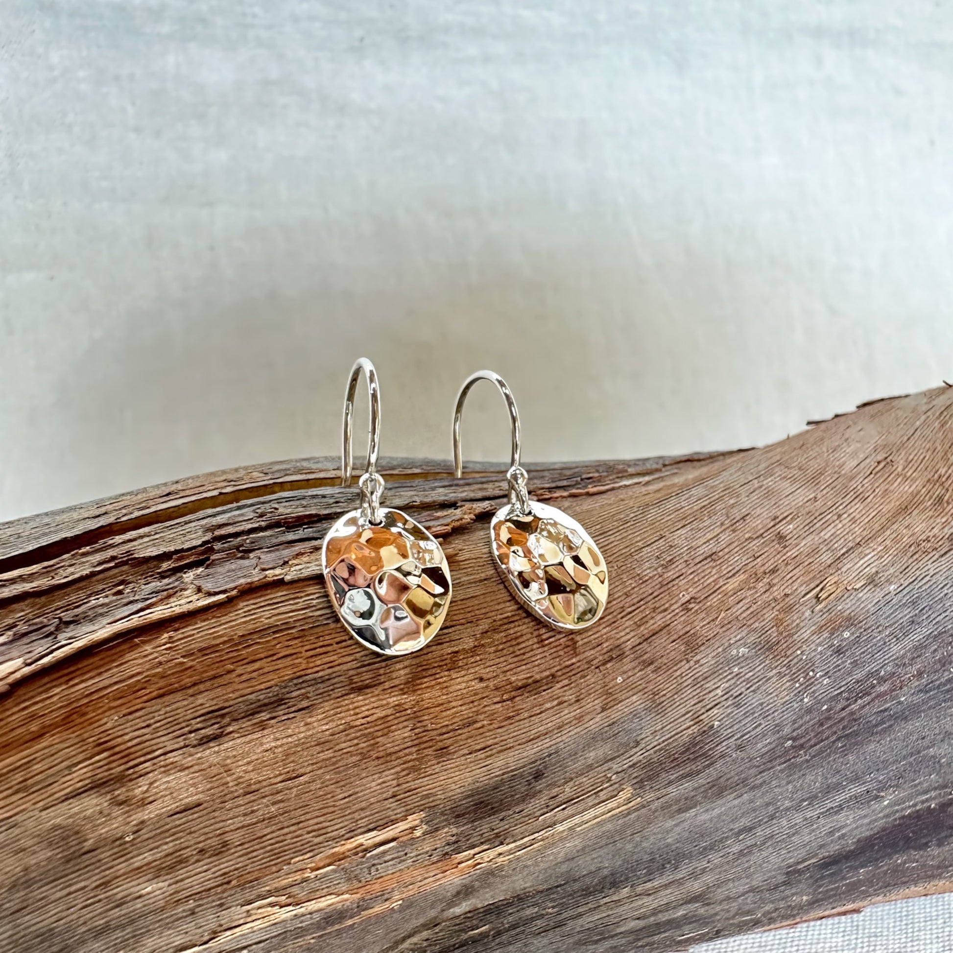 Delicado arete de plata 0.925 con diseño ovalado martillado, cuyo acabado refleja la luz de forma sutil y elegante. Mide exactamente 2.6 cm (1.02”) de largo desde el punto más alto del ojal hasta el borde inferior del óvalo. Hecho a mano en nuestro taller en Taxco, Guerrero, con atención al detalle y calidad impecable. Ideal para quienes buscan un toque refinado en cualquier ocasión. Disponible al por mayor para tiendas selectas en México y en el extranjero.